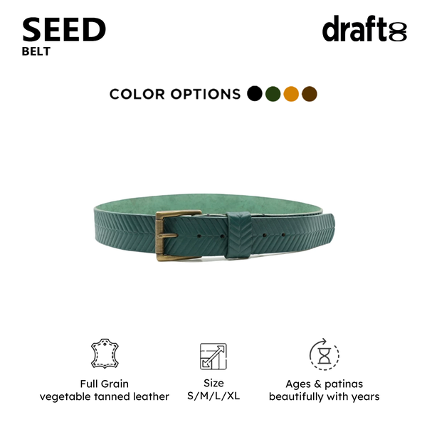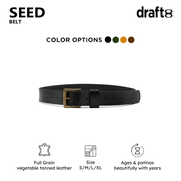 Combining minimalist structure with graphic detail, the Seed Pattern Belt is crafted from a single piece of full-grain vegetable-tanned leather. Its distinct chevron-like embossing gives depth and rhythm to the design, while preserving the raw, premium feel that defines every Draft-8 creation.